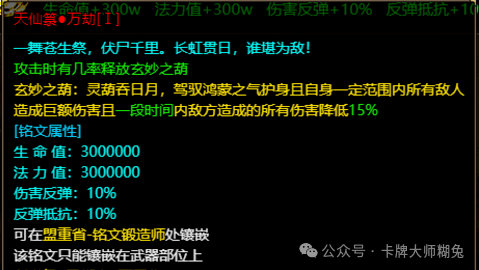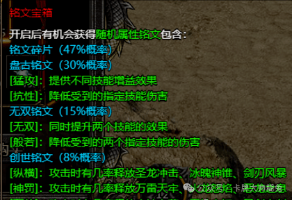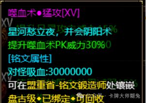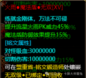 2.无双铭文相对盘古铭文而言是更高品阶的铭文,可以同时提供两个技能增益效果。如下图所示可以同时提供对怪吸血和切割伤害的增益效果。
