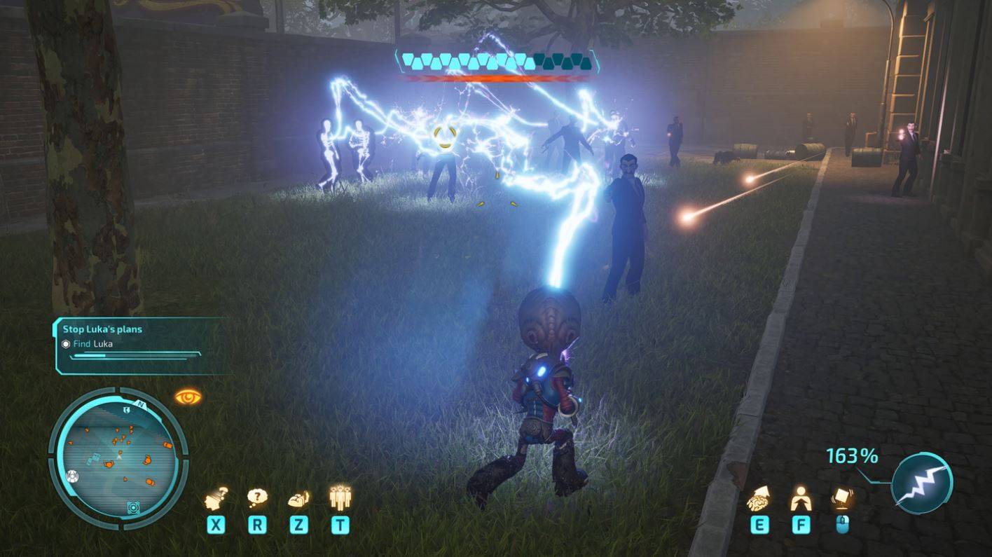 游戏战斗容易的一大原因是任务中绝大多时候对付的都是人类敌人,就算在占据数量优势的情况下他们也很难造成什么威胁 —— 甚至就算玩家还没升级自己的军火开启更有效率的杀戮前他们就已经不堪一击。游戏中玩家还可以靠念力快速抓住敌人并把他们丢上空中,这种杀戮方式不仅比用射线枪轰炸敌人要来的更快,而且还不消耗弹药。