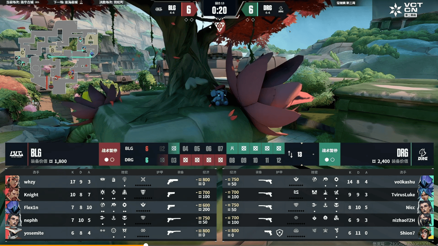 第8回合BLG选择A大对枪拿到人数优势,nizhaoTZH开启蝰蛇大招但被yosemite配合Knight铁壁大招双杀拿到BLG上半场第二分。第9回合whzy顶住C点压力一波四杀为BLG吹响反攻号角。DRG叫出暂停。