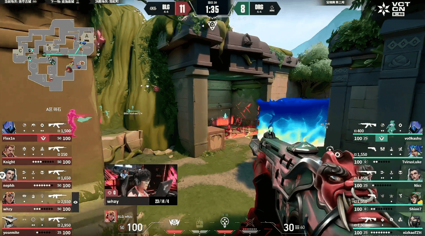 第20回合BLG对枪拼掉TvirusLuke拿下首杀,但紧接着voOkashu架死Knight还以颜色,随后BLG依靠战术布置拉扯DRG防守方阵型,通关中路后迅速转到A点且断掉DRG回防,BLG开始反攻。