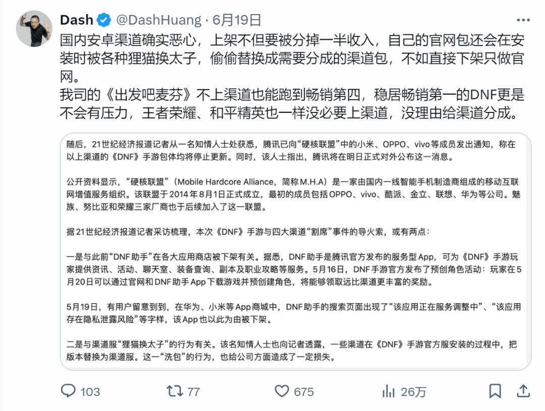 心动游戏CEO黄一孟就在他的个人社交媒体上表示:“国内安卓渠道确实恶心,上架不但要被分掉一半收入,自己的官网包还会在安装时被各种狸猫换太子,偷偷替换成需要分成的渠道包,不如直接下架只做官网。”