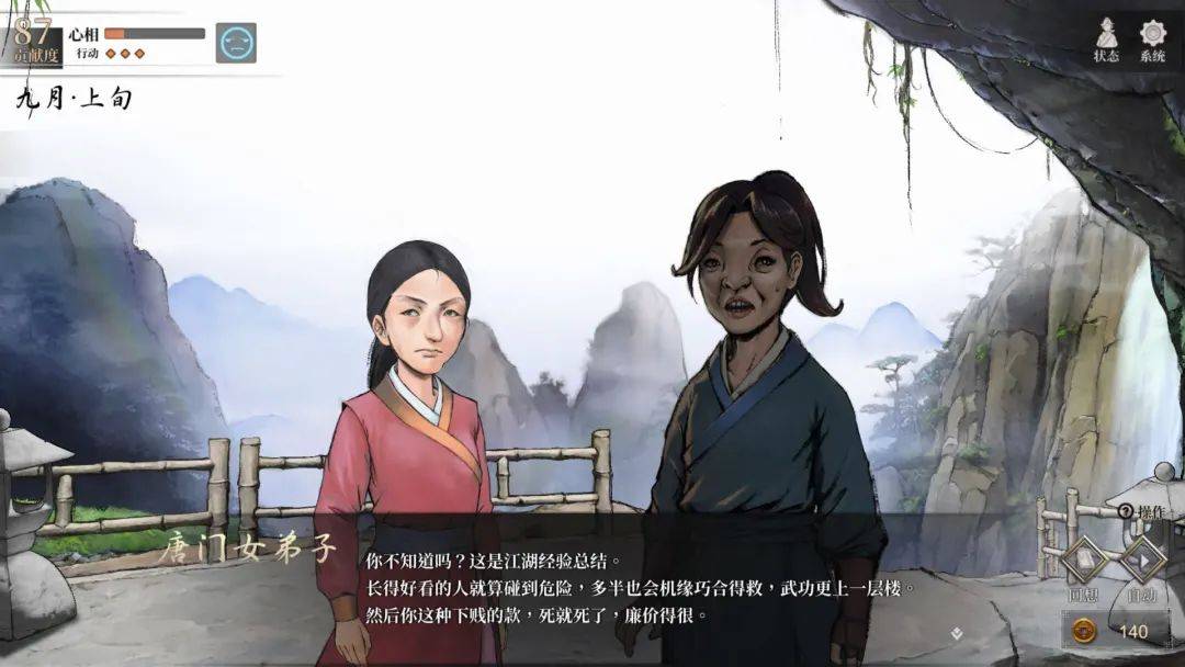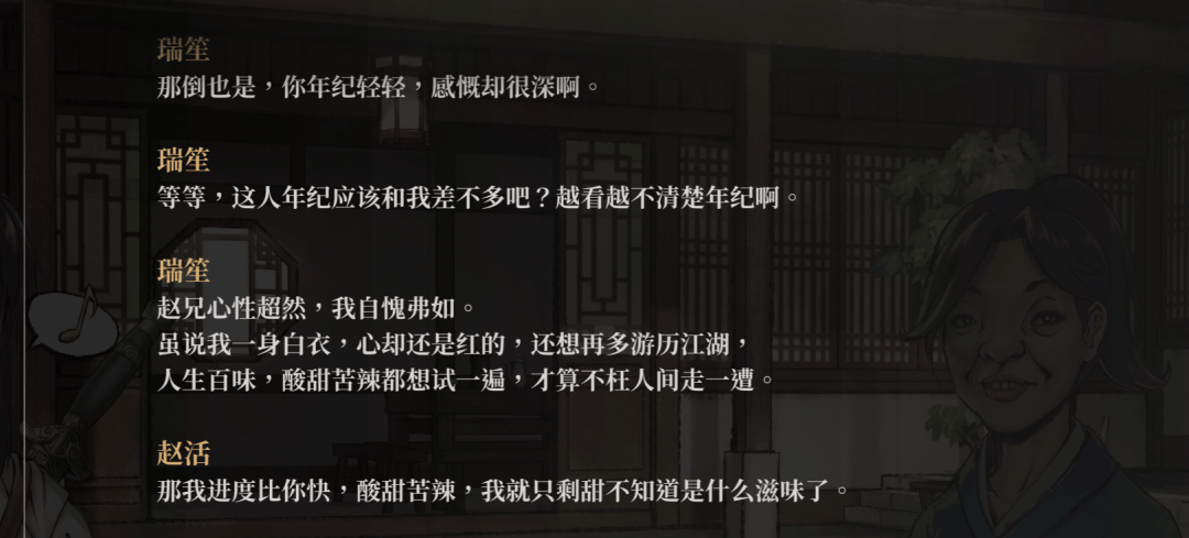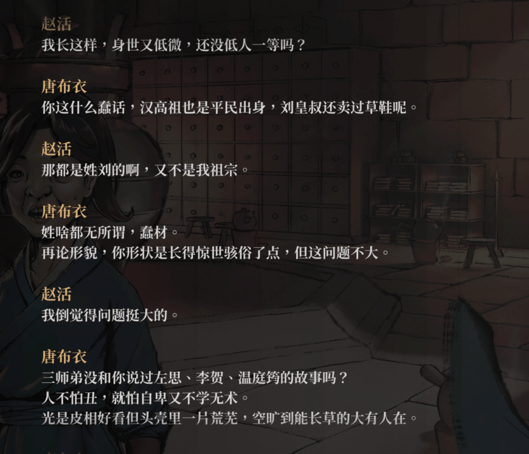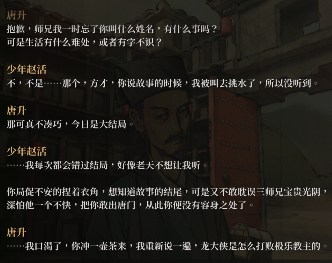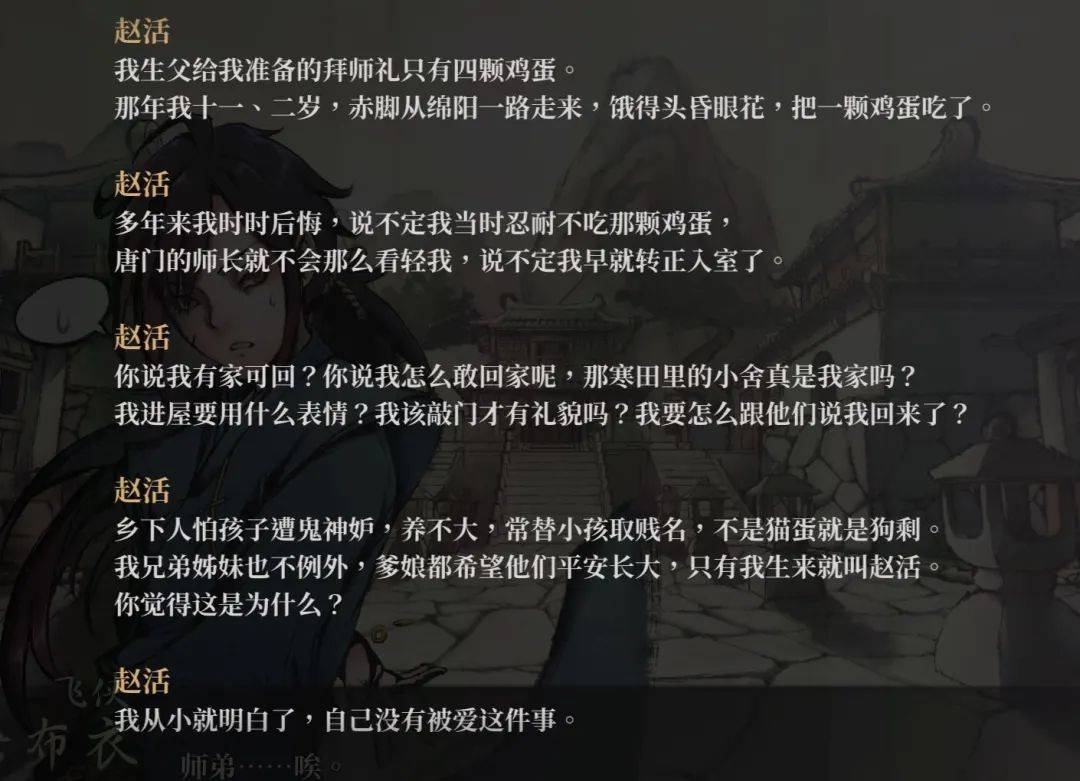 也有朋友这样问我:面对前期那些憋屈和游戏性上的缺憾,你是怎么坚持下来的?我的回答是:在试玩过十几个小时之后,我已经被《活侠传》的叙事、文案、角色塑造折服了。为了这些,我愿意忍受或原谅它游戏性上所有的缺点与不适。我是认真的。