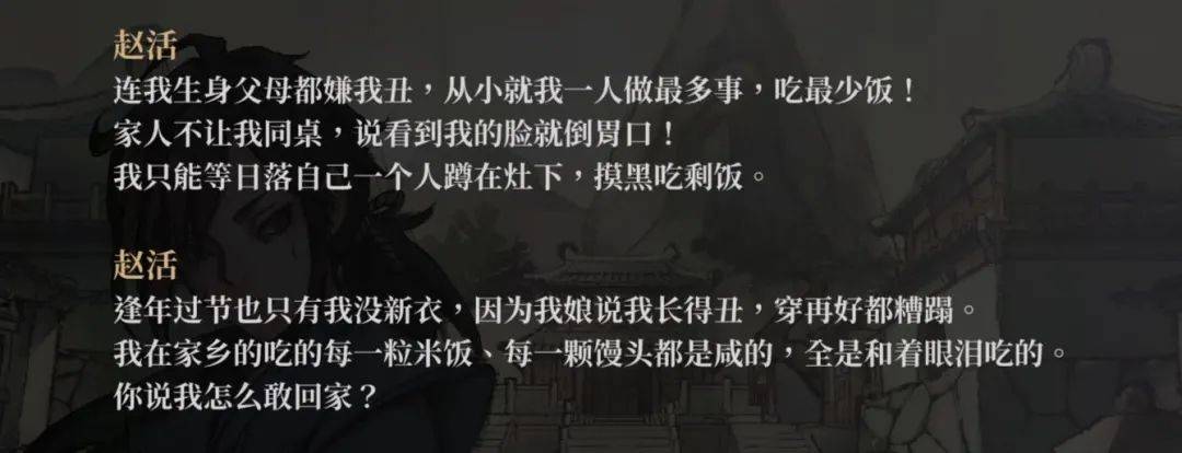 很多人会觉得,赵活的「丑」,是作者为了驱动故事设置的核心要素,除了有噱头之外,并不利于大部分相貌正常、五官端正的玩家代入和共鸣。