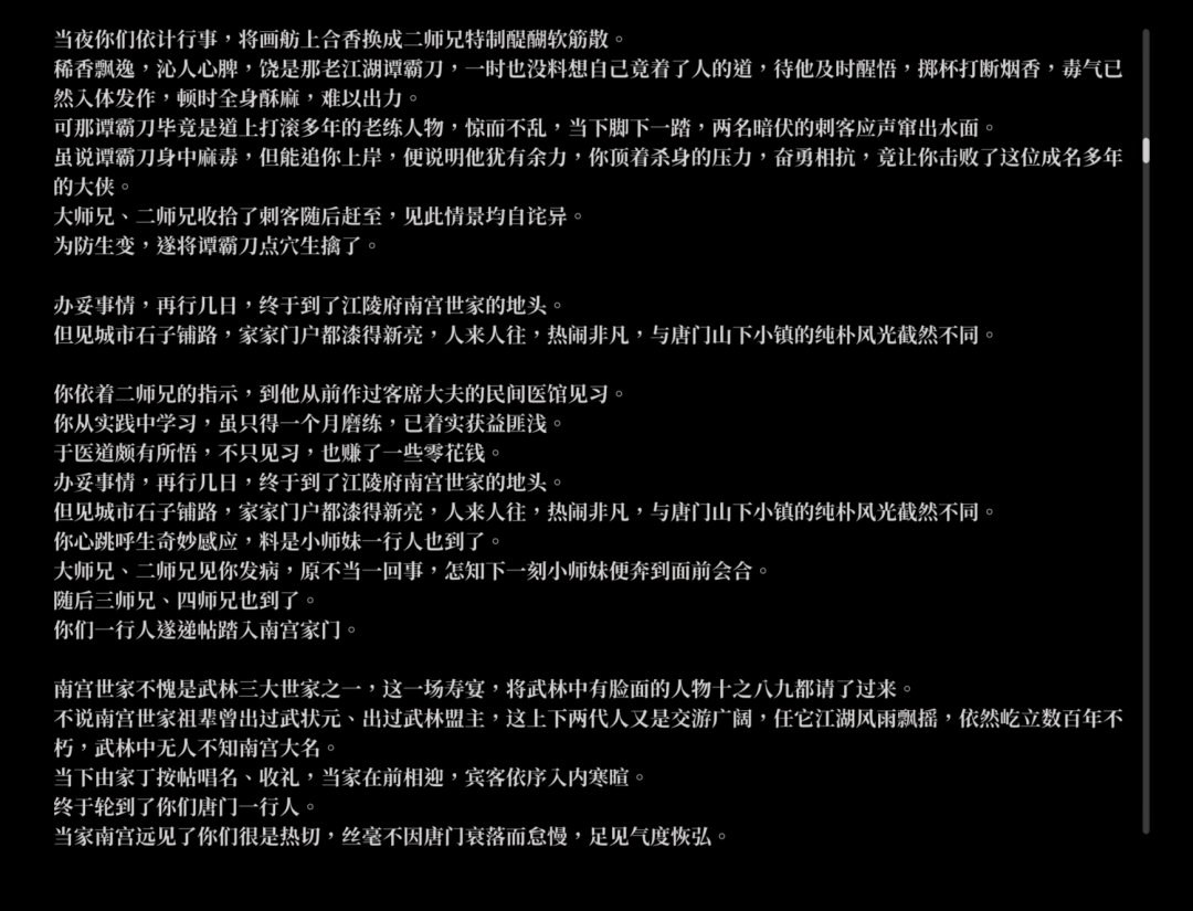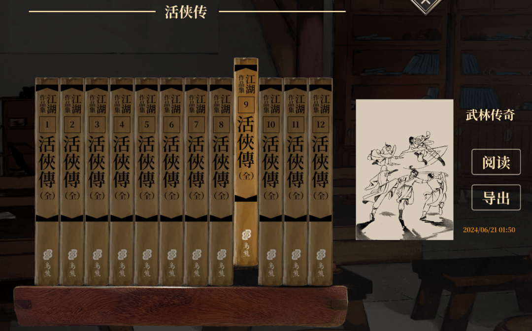 这种构思其实很不错,可以这么说:它是一种「叙事肉鸽+养成RPG」产品。最能体现这一点的,是游戏中的「传奇」系统:在你触发每一段剧情后,系统都会在一个角落里,把你的经历编纂成文,最终整理成一本书册。当你走到结局,可以翻阅一本叫《活侠传》的书,来回顾赵活这一生从头到尾的故事。