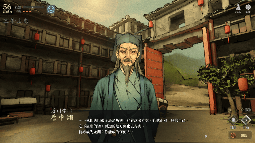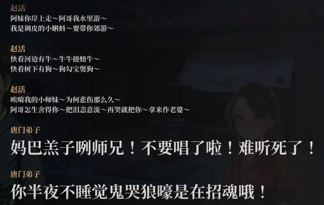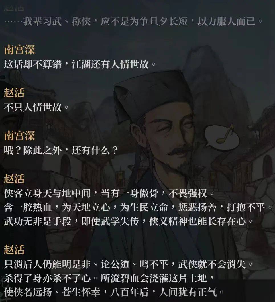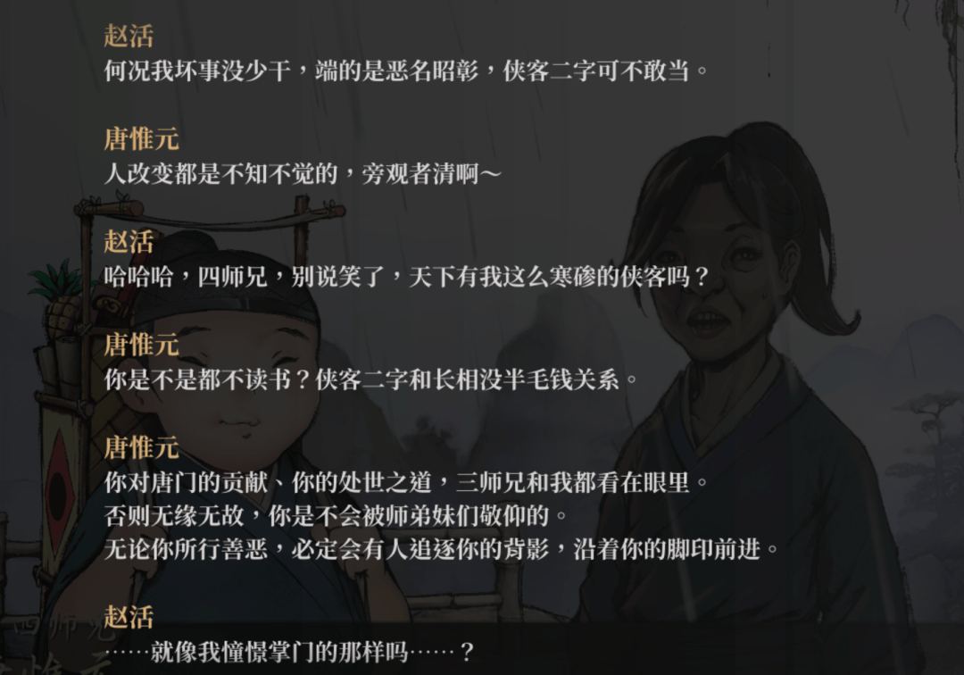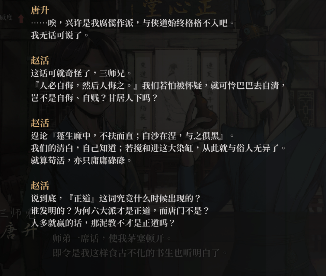首先,《活侠传》的文案很有武侠的感觉,既能适当地引经据典,又有足够深刻的讨论。比如唐门内部讨论是否要自证,赵活在一项分支里先是引用了孟子的话,继而引用荀子的《劝学》来讲道理,把饱学之士三师兄都辩得无话可说,也引发了玩家对正道的思考。