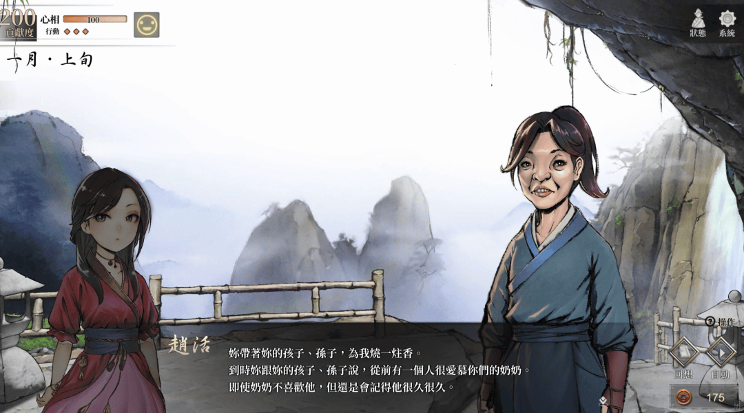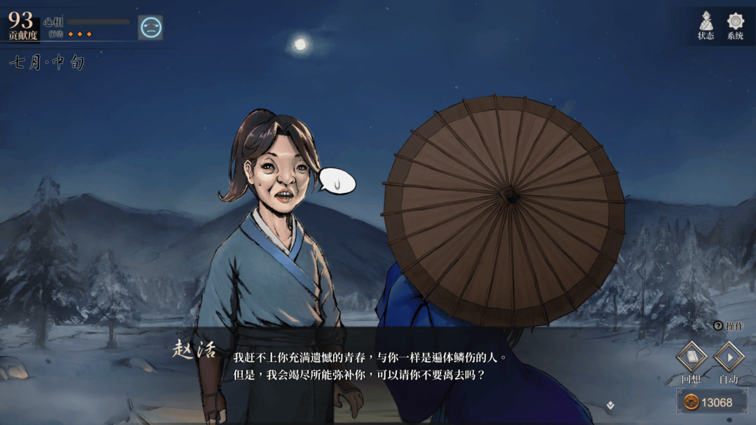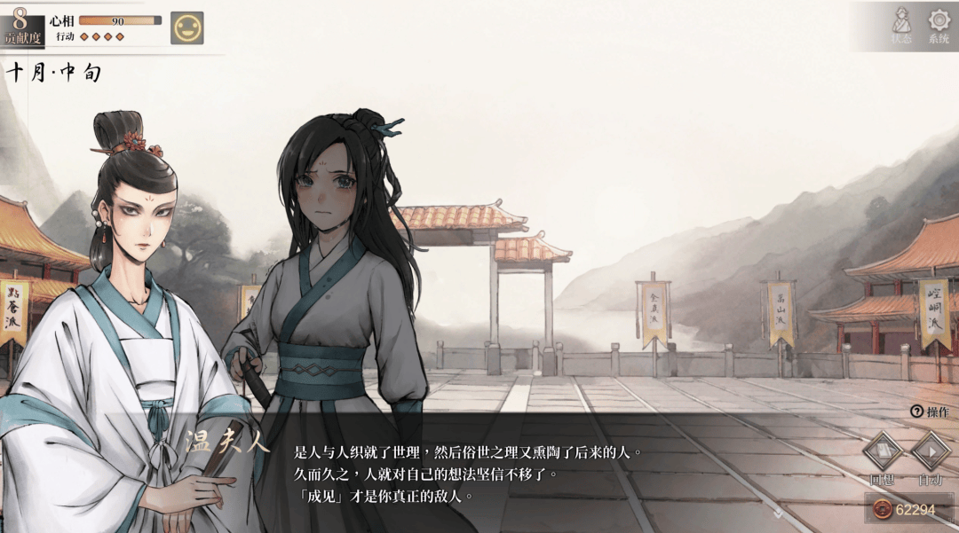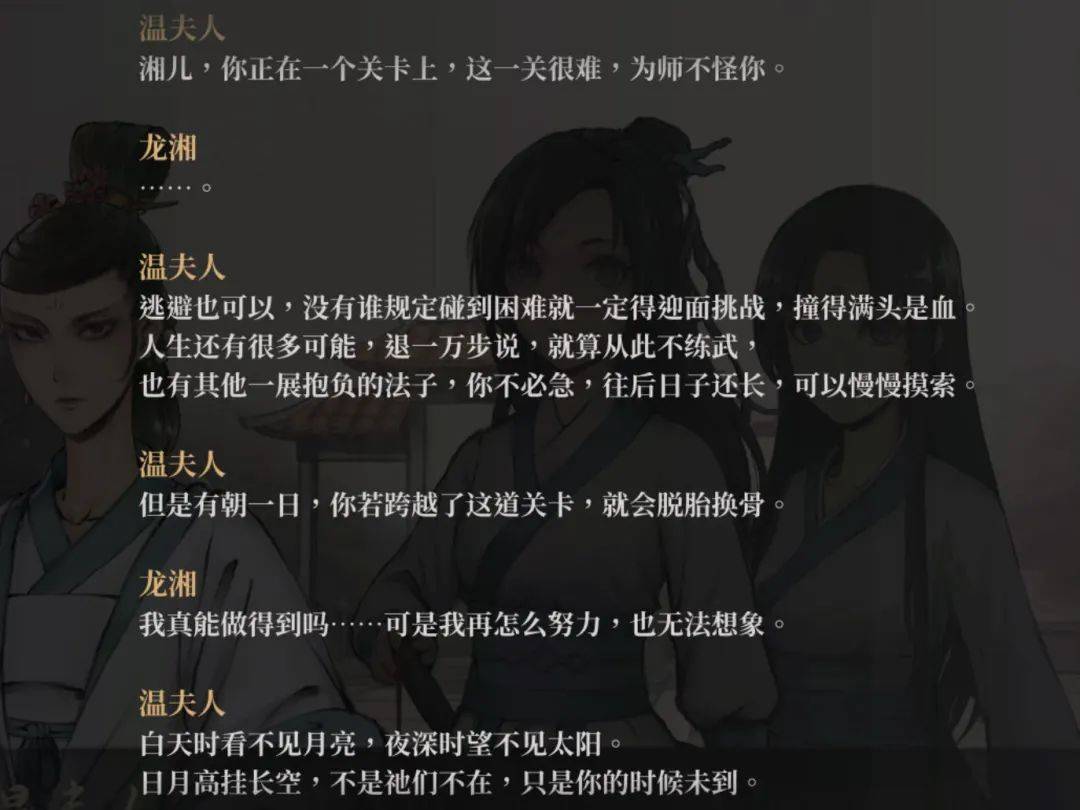 有时游戏中的角色也不会像这样掉书袋,但只是把寻常道理用自己的方式表述出来,同样别有一番滋味。比如温夫人对龙湘所说的:「白天时看不见月亮,夜深时望不见太阳。日月高挂长空,不是它们不在,只是你的时候未到。」