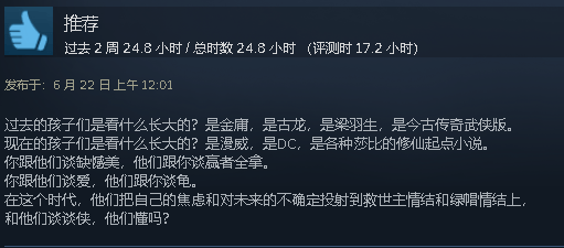 从大部分评论的情况来看,这是因为早期一些势头凶猛的节奏逐渐消退,一些冷静下来的玩家沉下了心,再加上难度调整,玩进去的玩家基本都get到了《活侠传》的难得之处。我想,这也在证明,好的武侠作品永远都有市场。