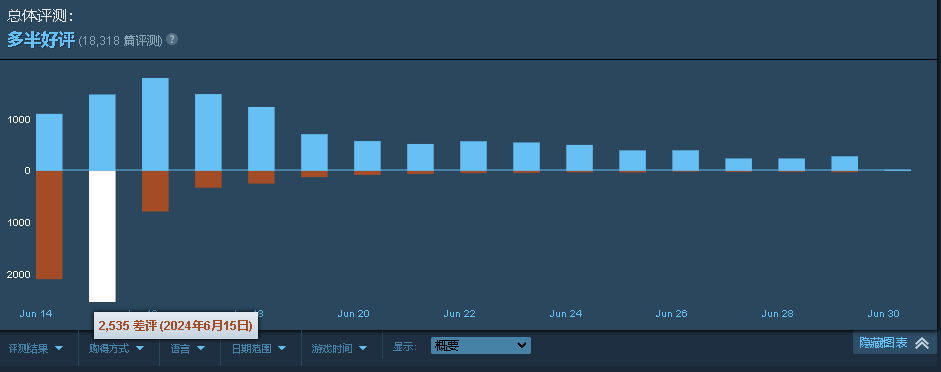 然而这样一款游戏,在Steam上发售后一度被打出「多半差评」,陷入挨骂风波。过了半个月,好评率才慢慢回升到「多半好评」。在核心玩家与大众之间,它的评价显得极度割裂。