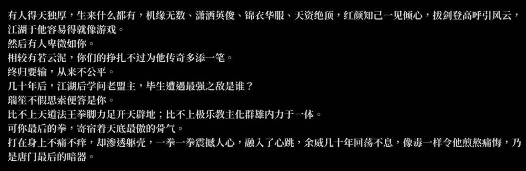 第二层,是它并非很多人印象里的恶搞游戏,所表达的内容,也不是传统武侠、爽文网文的套路。恰恰相反,它用极高的叙事和文字水平,把家国情怀、武林秘辛、儿女情长,都描写得荡气回肠。在内核层面,对武侠的解读也入木三分,既经典隽永又不落俗套。