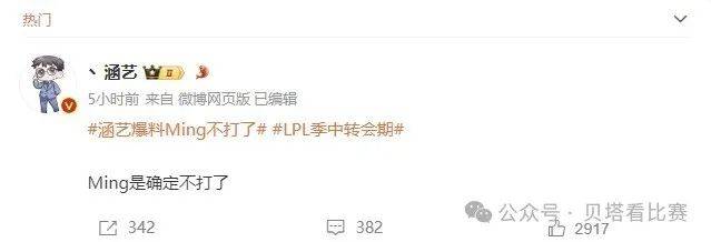 涵艺爆料的原文如下,他先是在29号爆料:ming确定不打了。这个消息这几年传过很多次了,但是这一次RNG成绩不佳,ming在场上的表现也不是很好,很多人都觉得可能性很大。