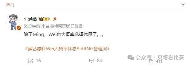 过去1天后,30号涵艺再次爆料:除了Ming之外,wei也大概率选择休息。wei休息也和ming的情况一样,自己在赛场上表现不佳,同时RNG成绩不好,所以有这种传闻很正常。