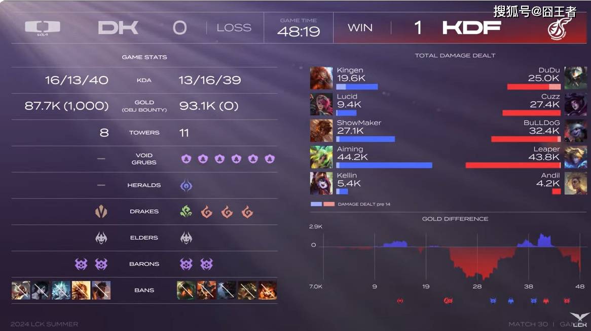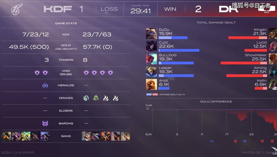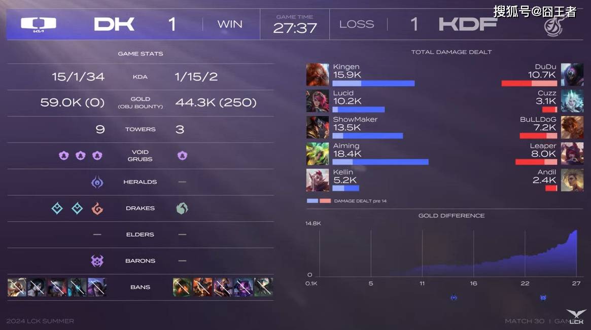 结果决胜局中,比赛前15分钟,双方打得平分秋色,经济无法拉开差距。但15分钟以后,DK玩嗨了,他们放弃了LCK式的运营,直接打起了LPL式大乱斗。期间,DK多次打出少换多团战,逐步拉开了差距。尽管KDF在22分钟左右,抢到大龙,但这丝毫阻止不了打嗨了的DK。24分钟左右,蔚绕后开到永恩,DK打出1换4大胜。最终29分41秒,DK打出0换4完美团后,直接一波赢下比赛。