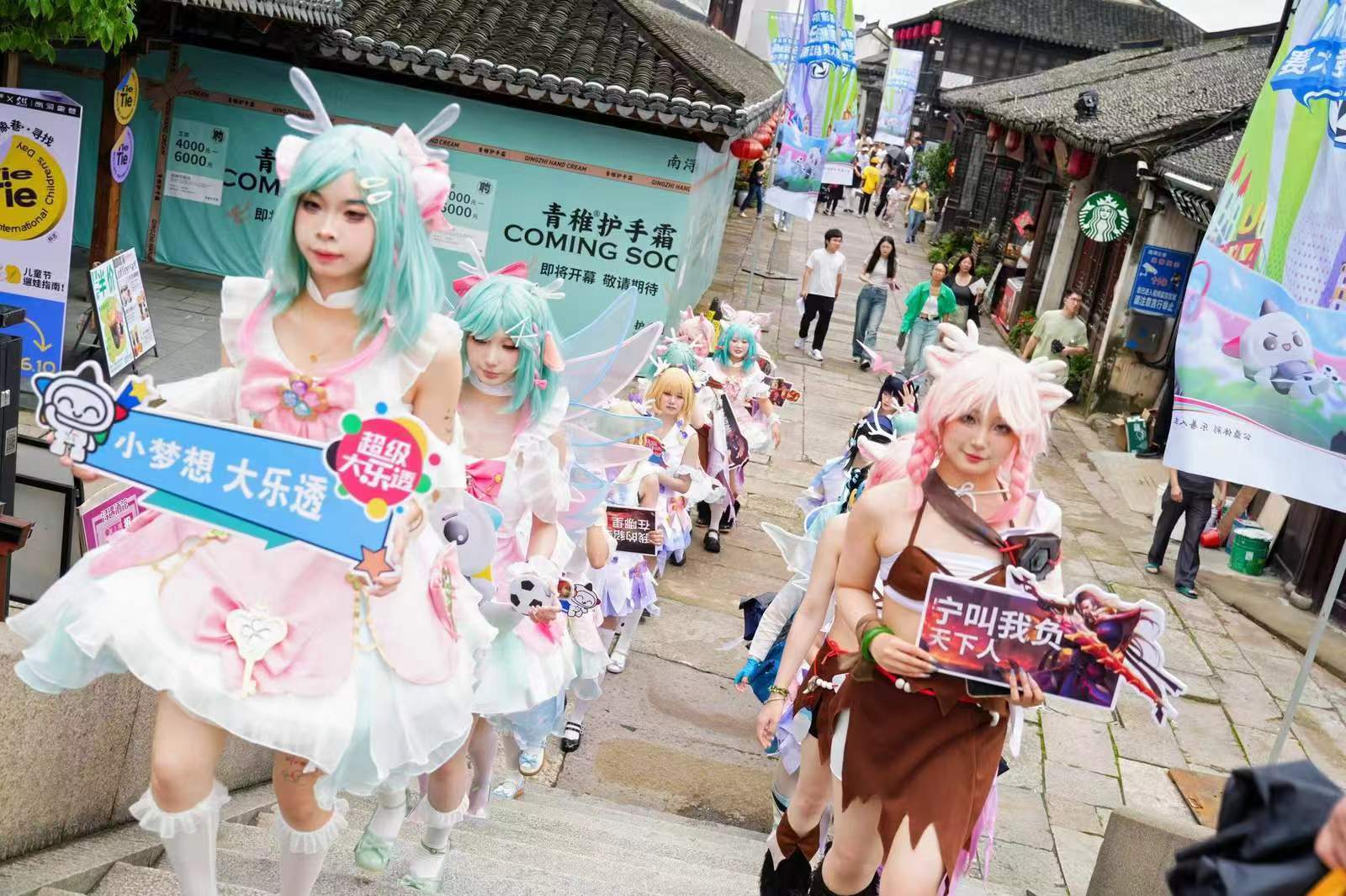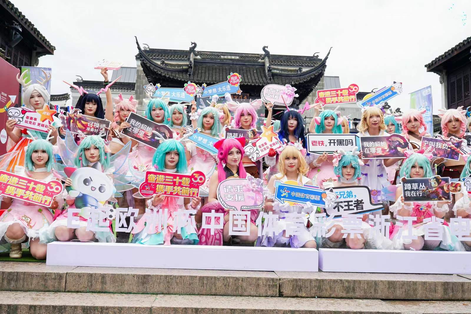 当然,最吸引眼球的当然还是本次“E起欧洲杯”的招“瑶”过市Coser主题大巡游活动了。当天,多位Coser齐齐扮成了《王者荣耀》人气角色“瑶”的样子。不仅在南浔古镇的游客码头上演了快闪舞蹈,还手持印有体彩元素和大赛画面的道具穿梭在南浔景区内,不断吸引游客上前合影,成为了当天古镇中一道靓丽的风景线。