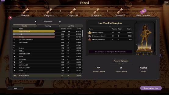 “黑暗嘉年华”为全新的无限地下城模式,勇敢的冒险者们可在该模式中发挥策略,尽可能地存活到地牢的更深处。冒险结束时,界面弹出的 “复盘总结”将记录冒险者在该模式中清空的房间数,楼层和得分。试着向好友或擂主发出挑战,让自己的ID霸占全球玩家得分 “排行榜”吧!