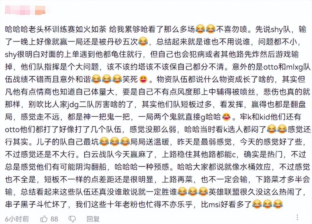 对此,很多玩家都表示,这次老头杯的节目效果真的比隔壁MSI都高,就现在看下来其实很多队伍是被高估了,如果比赛时没有一个让人信服的指挥,是很难打出该有的效果。这一点反倒是水晶哥、Letme他们做得比较好,都很听指挥,所以胜率都不差,也不会红温。