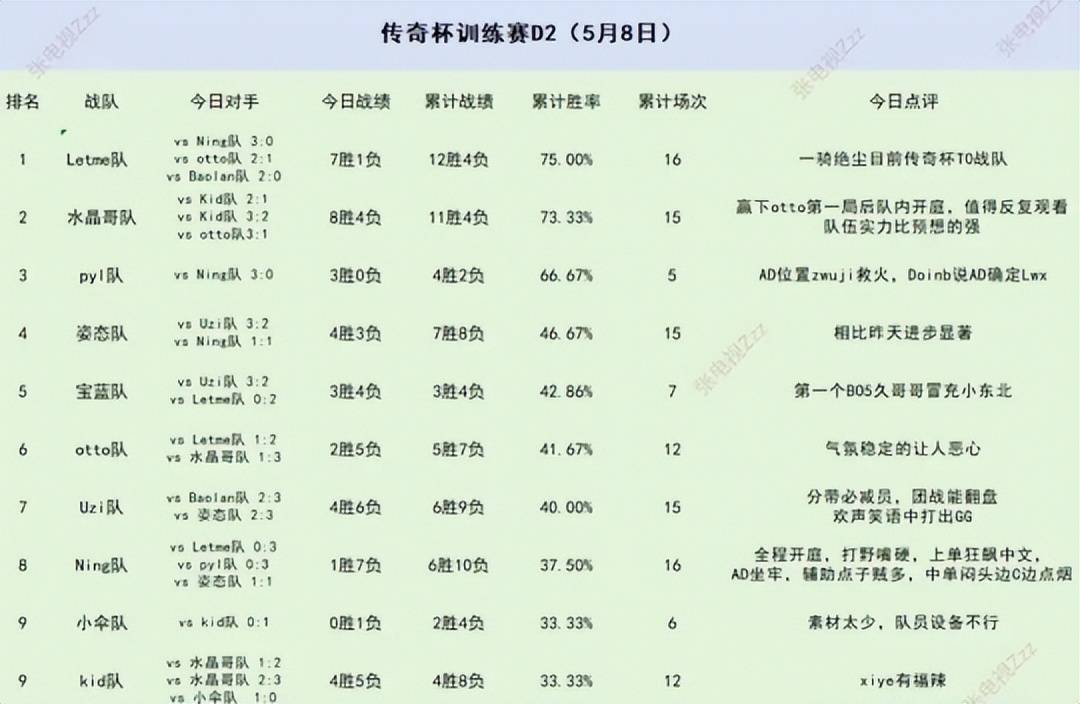 同时,根据热心网友统计出来的训练赛战绩榜单来看,Letme这个偷鸡选Imp 南风的队伍打出了大家期待的效果,胜率高达75%,但让人没想到的是,K神水晶哥的“捡破烂”队伍居然冲上了第二,胜率高达73.3%,中间还有一把是alielie强行玩薇恩浪输的。反倒是被大家寄以厚望的Uzi与Ning王的队伍,一个胜率勉勉强强40%,一个直接摆到了37.5%,给整个老头杯贡献了最大的节目效果。