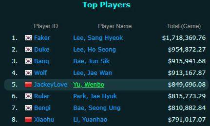 EWC沙特电竞世界杯LOL项目已于7月8日成功落幕,TES战队1:3憾负T1战队获得亚军。值得一提的是,TES战队的AD选手JackeyLove在收获了亚军奖金以后,已经超越了Ruler选手排名LOL选手奖金榜第五名,而现任WBG中单Xiaohu排在第八位。