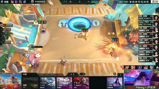 第六局比赛似乎是为CN赛区资格赛做了一个非常完美的收尾,在这一局比赛中,原本是六决斗大师的Flancy前中期的运营非常顺利,这也是让他顺利来到了十人口。而这一局比赛决赛圈Flancy的对手琉璃则是凭借着迅捷射手阵容强势来到决赛圈。只不过,从当时的情况来看,即便Flancy来到十人口,但六决斗大师的羁绊也并不足以让他登顶。在这样的情况下,Flancy果断选择了追三星刀妹。而更有趣的是,其实琉璃可以稳稳拿下比赛,因为就在Flancy有八个刀妹的时候,琉璃正好是在自己的卡池中卡了一张。不过,或许是因为琉璃也想追三星乌迪尔的缘故,琉璃最终并没有选择卡住这一张刀妹,这也让Flancy在最后关头成功培养出三星刀妹。反倒是琉璃,并没有达成三星乌迪尔。至此,三星刀妹的出现也瞬间让比赛没有了任何悬念,而Flancy则是凭借着三星刀妹成功在第六局比赛登顶。