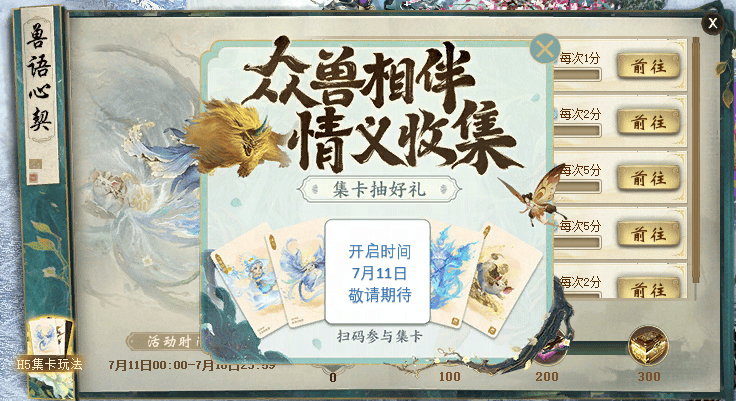 同时,7月11日,在游戏内兽语心契界面打开并扫描二维码,体验H5集换卡牌小玩法《众兽相伴》,有机会获得众多实物好礼!