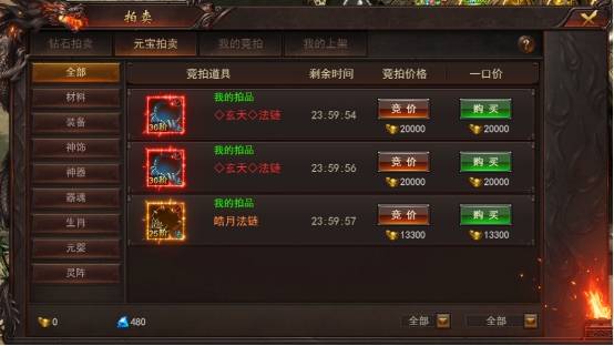 部分非绑定装备道具可以在拍卖系统上架进行拍卖。点击我的上架,急售道具栏显示的道具即可上架出售,上架时可以选择元宝或者钻石拍卖。