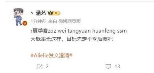 出来爆料的就是涵艺,他表示RNG夏季赛阵容被曝光,上路和AD换人,他的原文是:夏季赛RNG的阵容大概率是上单ZDZ,打野wei,中单tangyuan,下路焕烽加Ming。他觉得这个阵容可以冲击一下季后赛了。