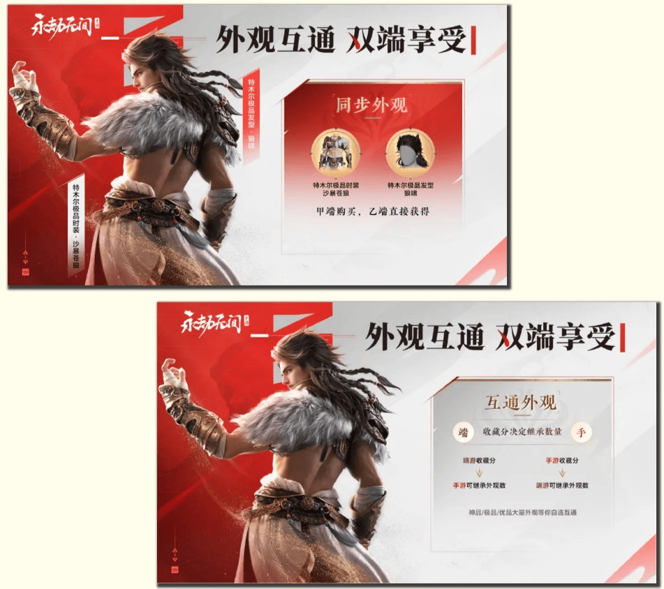 关磊:端游运营三年,有很多英雄和武器外观已经深入人心,它们代表了永劫IP,比如阔刀狼主,就是永劫武器的代表,劫友们也都费尽心思想得到一把狼主,像这样标志性的外观,手游里肯定要有的。但是,手游难道还要让大家再花钱买一模一样的外观吗?