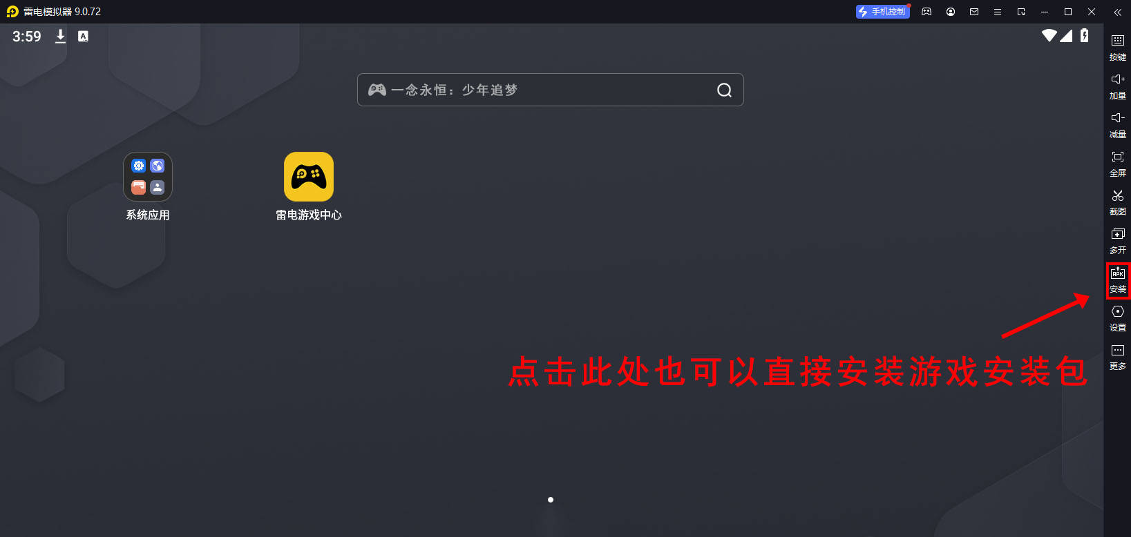 如果玩家们已经在官网或者其他渠道下载好了一念永恒:少年追梦的APK文件,也可以直接将APK文件拖进模拟器或者点击右侧的APK安装按钮,即可自动解析安装。