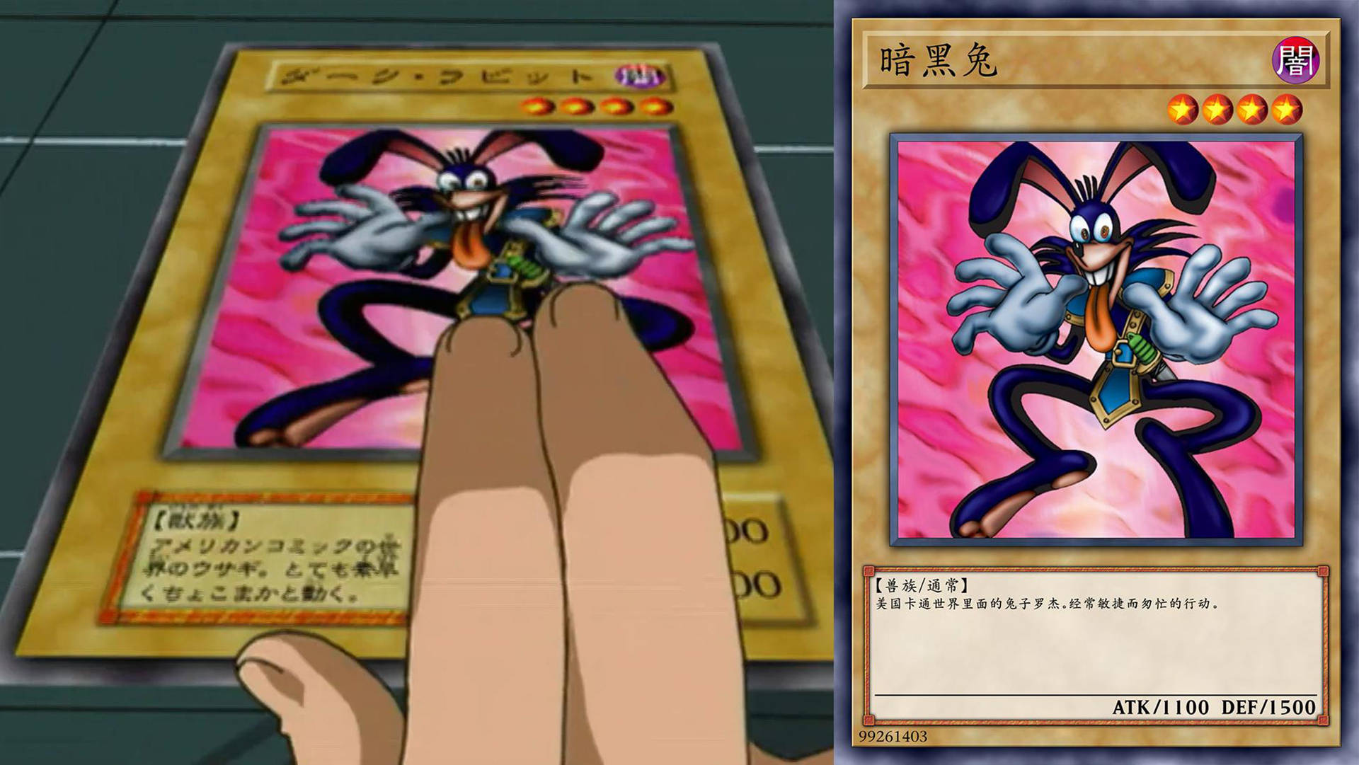 暗黑兔[怪兽|通常]兽/暗[★4]1100/1500。描述:美国卡通世界里面的兔子罗杰。经常敏捷而匆忙的行动。