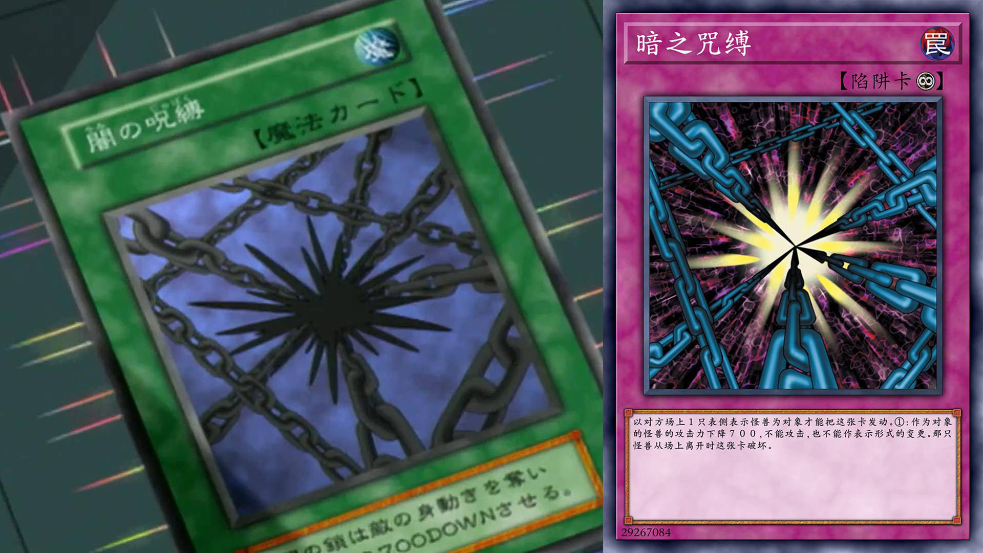 暗之咒缚[陷阱|永续]。效果:以对方场上1只表侧表示怪兽为对象才能把这张卡发动。作为对象的怪兽的攻击力下降700,不能攻击,也不能作表示形式的变更。那只怪兽从场上离开时这张卡破坏。