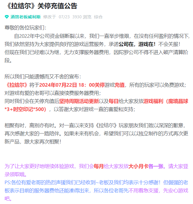 (图:在TapTap上的官方公告曾表示“还能凑出服务器费”……)