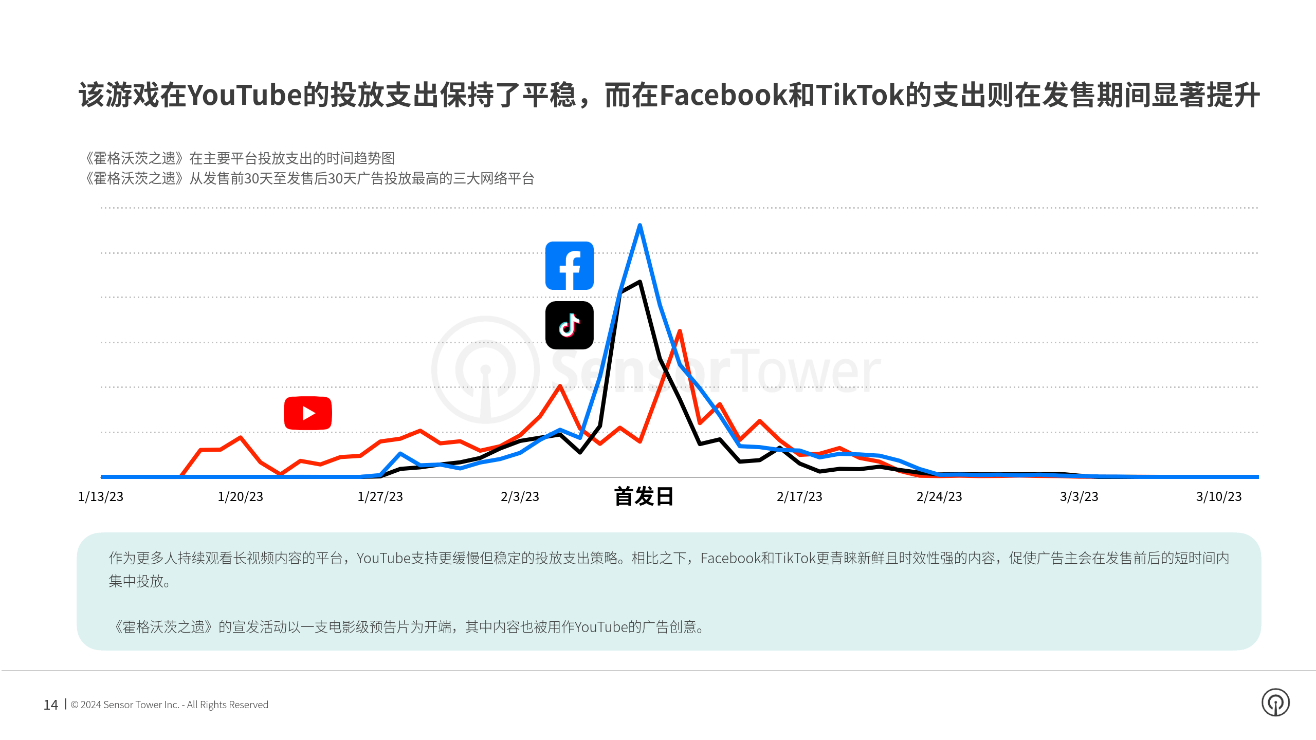 2023年广告支出最高的四款首发游戏分别是《霍格沃茨之遇》《暗黑破坏神I》、《使命召唤:现代战争川》(2023)和《星球大战绝地:幸存者》。其中,《霍格沃茨之遗》和《星球大战绝地:幸存者》是老牌S级IP的新作,可能需要大量预算进行推广,由此说服玩家再次投入已有很多专属游戏的IP。