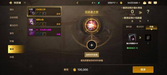 继承核心:继承功能主要涵盖强化充能值、特性和附魔。合理利用这一功能,可以大大节省重复打造装备的时间和资源。