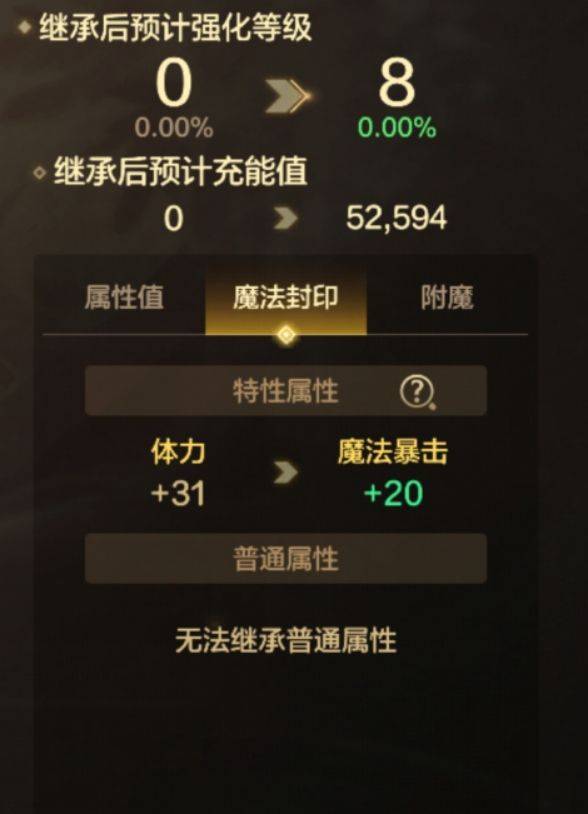 特性继承主要针对史诗装备的大词条,小词条无法继承。在选择继承时,务必确认是否需要继承特性属性,并在右下角勾选相应选项。如果不确定继承后的特性是否正确,可以在“魔法封印”处查看详细属性。