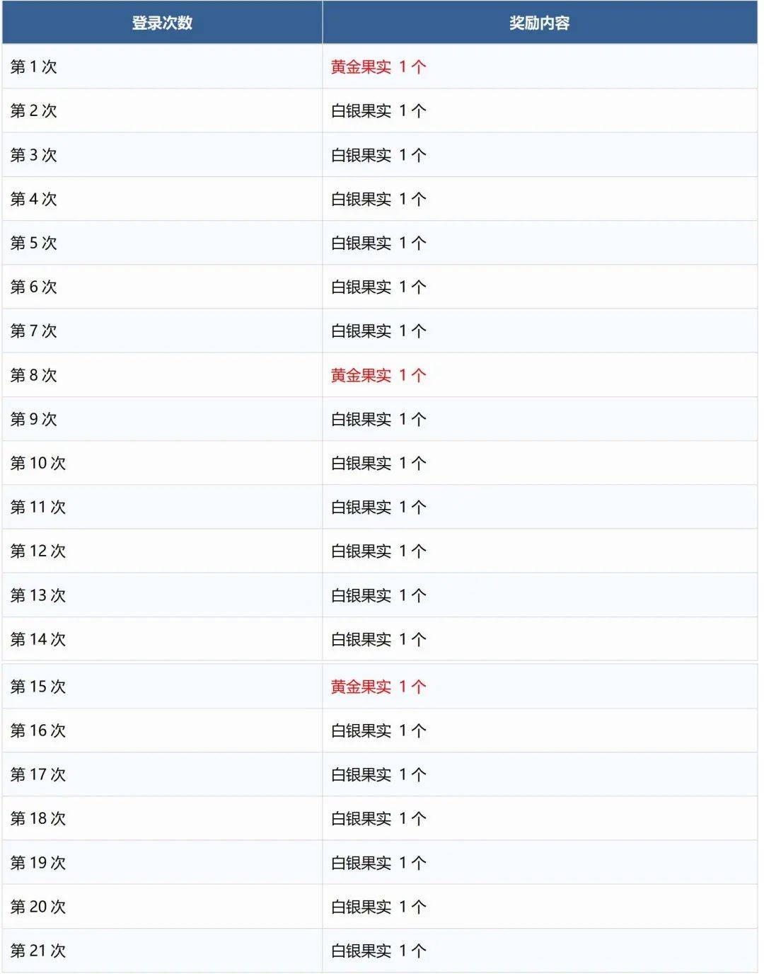 在以下时间段内登录21次(1天计1次),即可获得3个黄金果实、18个白银果实!