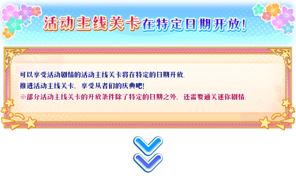 此外,推进至特定的活动主线关卡后,与「慰问关卡」「迷你剧情」不同的特别关卡将开放,全新的活动主线关卡将开放。