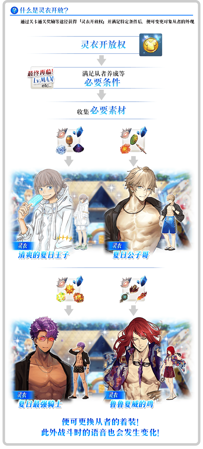 ※「★5(SSR)奥伯龙」「★4(SR)高文」「★4(SR)崔斯坦」「★4(SR)兰斯洛特(Saber)」的灵衣开放权只能在限时活动「从者·夏日·庆典2024!」的活动道具交换期间内获得。