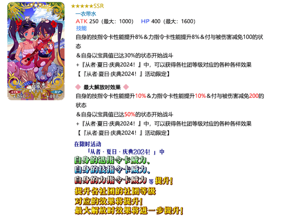 装备活动道具交换和任务报酬中可获得的活动限定概念礼装「★5(SSR)一衣带水」,在限时活动「从者·夏日·庆典2024!」中将发挥各种各样的效果。