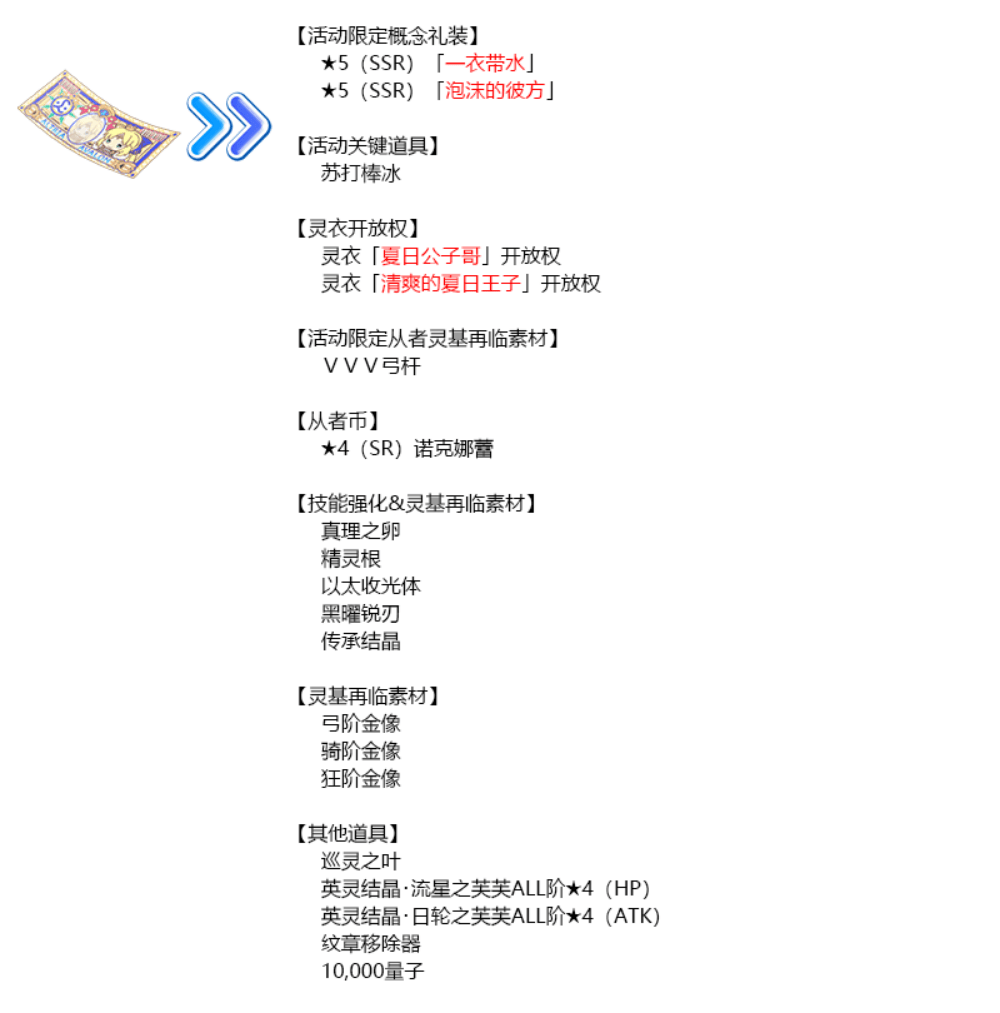 详情请参考「从者·夏日·庆典2024! 阿尔托莉雅·卡斯特(Berserker)推荐召唤」公告。