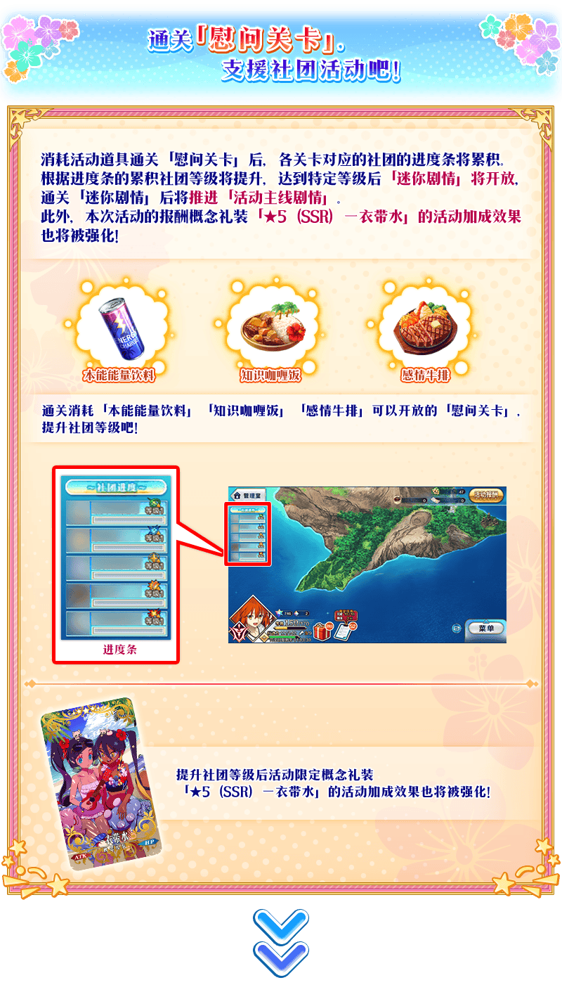 此外,通关关联的活动主线关卡后,除了可以搜集活动道具的自由关卡之外,「慰问关卡」「迷你剧情」也将开放。