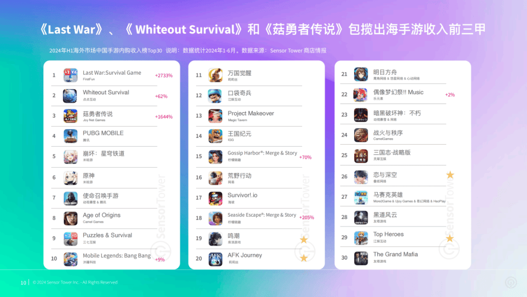 2024上半年,4399的《冒险大作战》海外版双端合计收入3.78亿美元,断崖式领先。点点互动的《无尽冬日》成功进入今年6月全球手游收入TOP10位列第9名,Sensor Tower预估其目前全球累计下载量达到5250万次,总收入达到9.35亿美元。