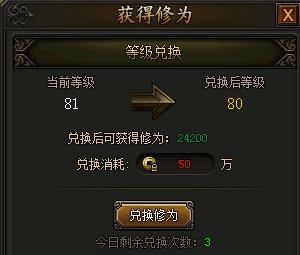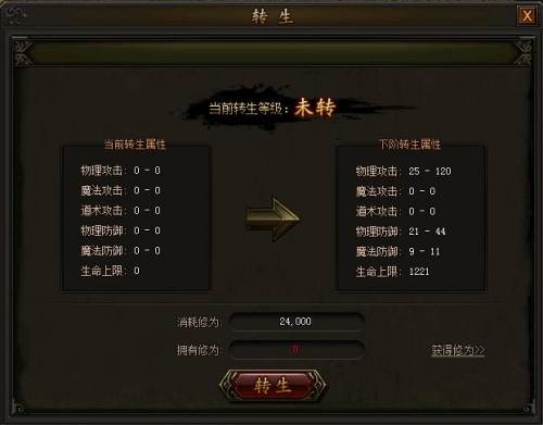 转生等级提升需要消耗转生修为,可以通过活动、礼包、商城等得到的修为丹来获取修为,也可通过消耗经验和金币兑换大量修为。