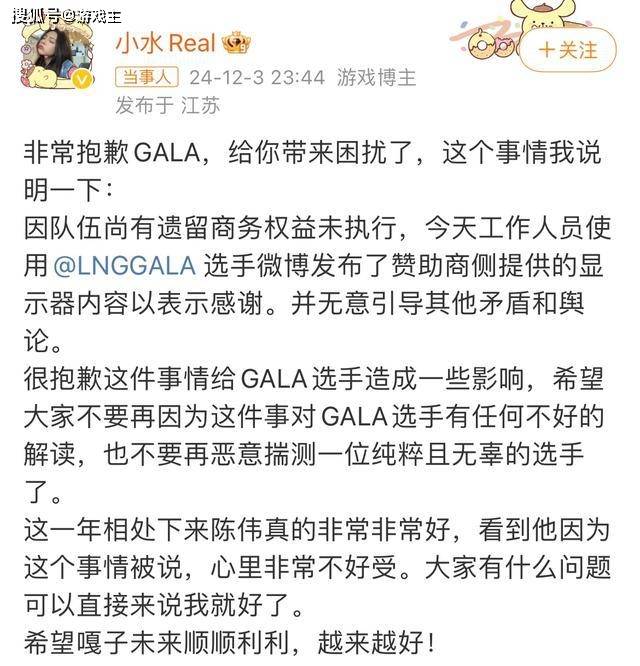 晚上的时候gala发布了一个新的显示屏,并且还照到了游戏界面,使用ig冠军皮肤的卡莎,这个事情一出,迅速引来了全网玩家的热议。战队官方虽然没有官宣,但是gala本人自爆了,不知道是不是官方的紧急公关。Lng战队的工作人员在第一时间发表了声明,表示这和AD选手gala没有任何的关系,全部都是lng战队方操作的,虽然gala已经离开了队伍,但队伍上流有商务权益未执行,所以工作人员使用gala的账号发布了赞助商的显示器,很抱歉,对选手造成了影响,希望大家不要再因为这件事情对选手有任何恶意的解读。