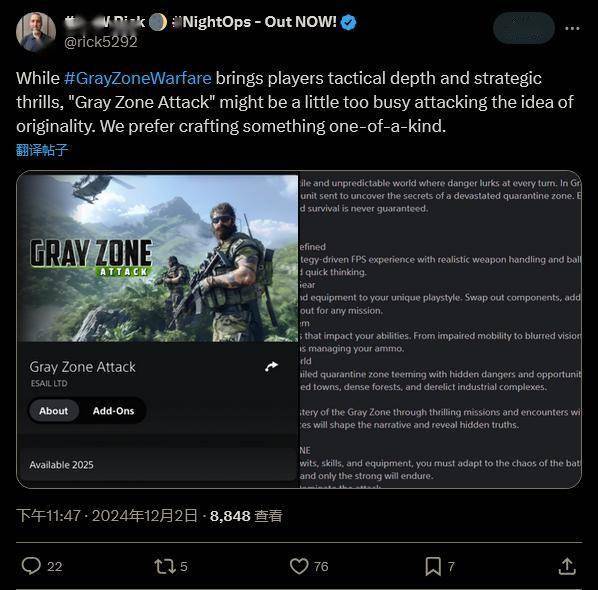 最近有玩家发现,在 PlayStatoin 商店中出现了今年 4 月推出的热门开放世界撤离类 FPS 游戏《灰区战争》的山寨版。名为《灰区进攻(Gray Zone Attack)》,它与原作只有一词之差,并宣称将于 2025 年发布。