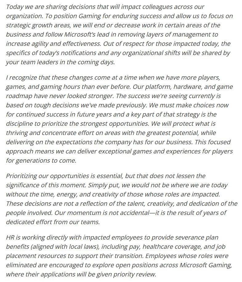 #微软游戏部门大规模裁员# 据外媒消息,微软再次对Xbox部门进行大规模裁员,《糖果传奇》开发商King将裁员10%,约200人。ZeniMax Media的营销团队、Xbox旗下的一些美国团队也将进行裁员,具体规模暂不知晓。