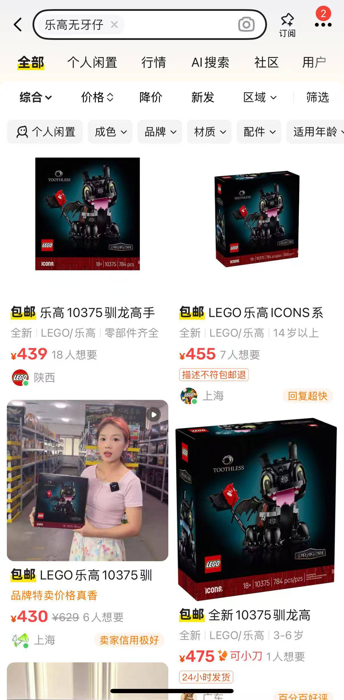 7月1日,乐高新品“无牙仔”积木正式上市,这款产品是正在热映的真人电影《新·驯龙高手》中的热门IP,也是乐高集团面向成年玩家推出的Icons 系列。淘宝官方旗舰店显示,该产品售价629元。发售前,乐高新产品“无牙仔”在社交平台上热度不低,目前处于天猫益智玩具新品榜首位,淘宝APP显示,“有38万+人关注”。