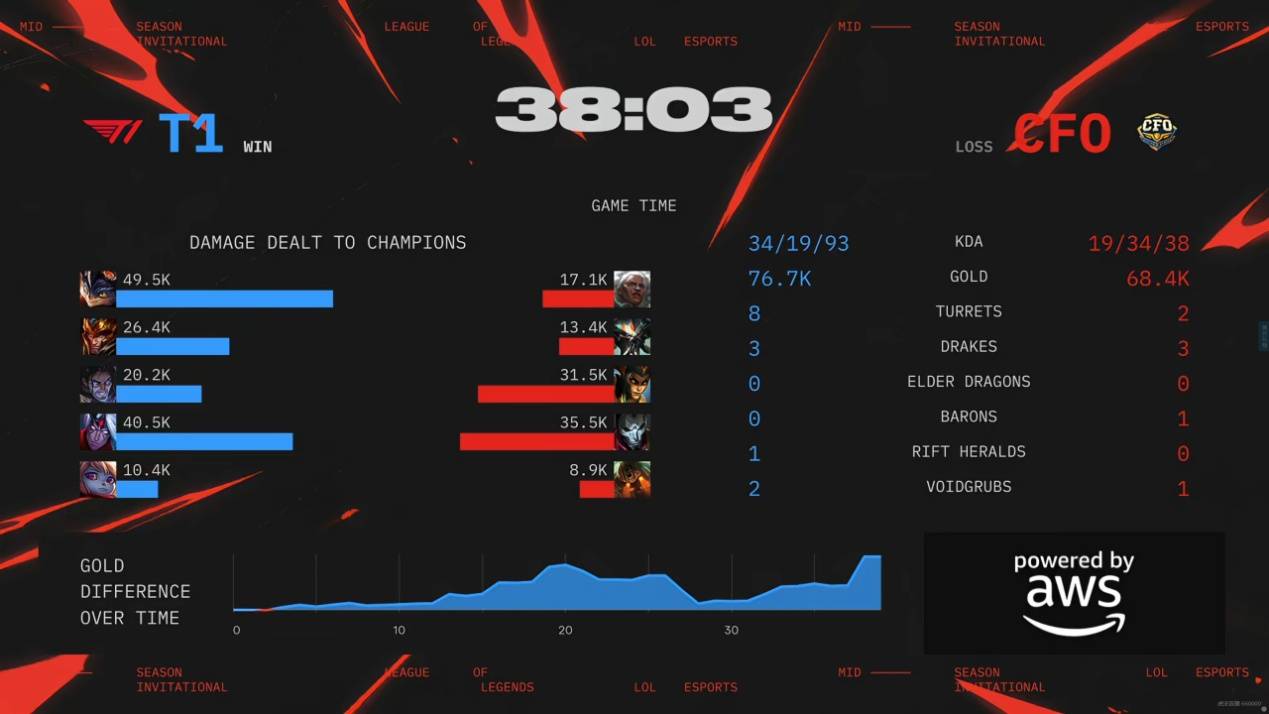 后续CFO残局寻求人头互换,但依然面临团战溃败,此时T1的经济领先已经达到七千多,T1完全解锁了自己的最强形态。