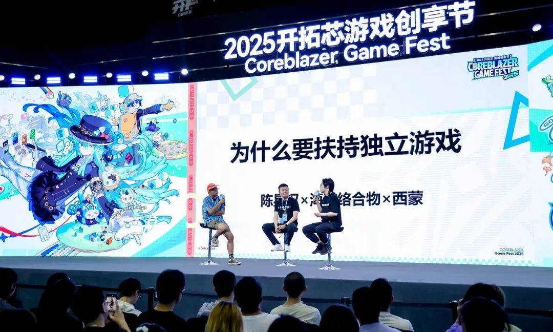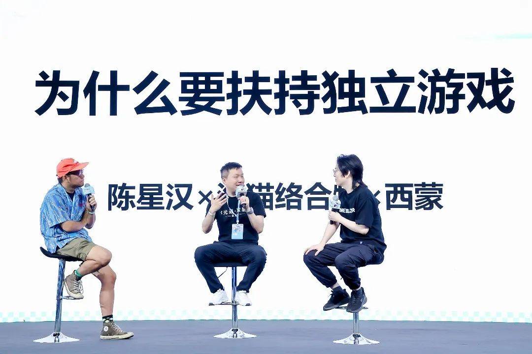 活动第一天的试玩和嘉宾分享同时在进行。KEIZO的分享结束后,鹰角网络联合创始人海猫络合物、thatgamecompany CEO 陈星汉以及机核网创始人西蒙,围绕“为什么要扶持独立游戏”做了一场对谈。