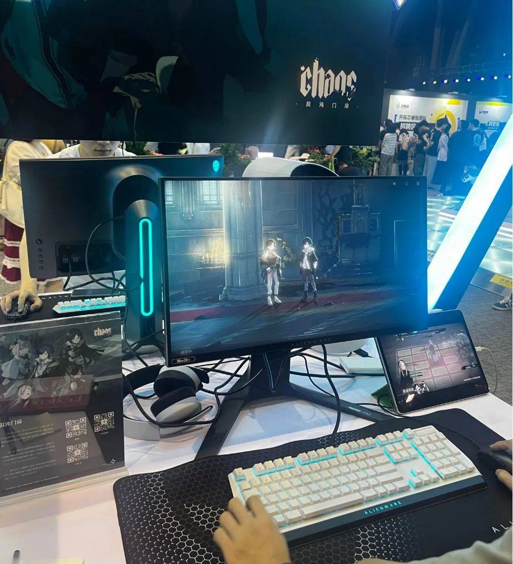 在开拓芯创享节的试玩区域现场,错落置放着安装了不同游戏demo的外星人PC整机,有的还单独安放了一台iPad展示游戏PV。