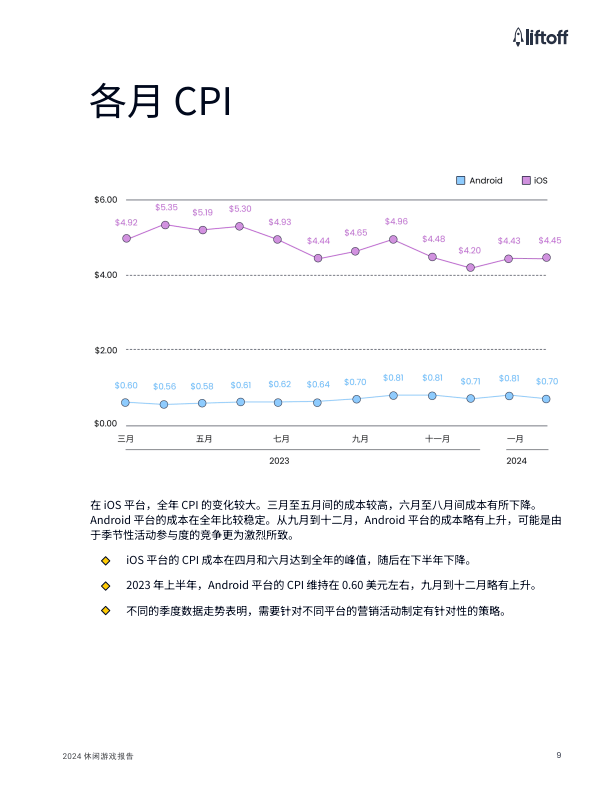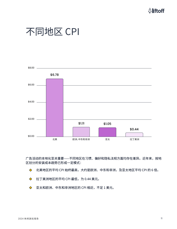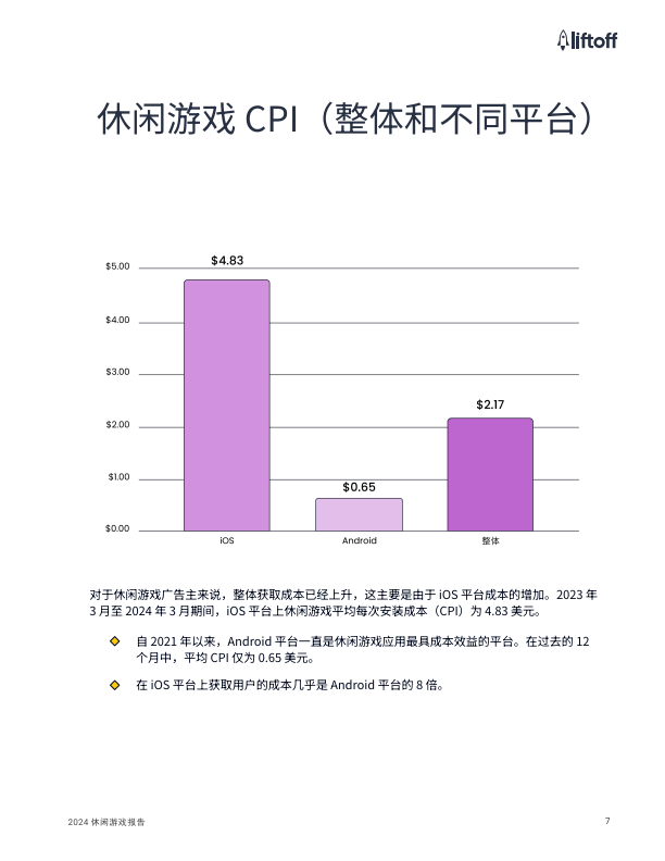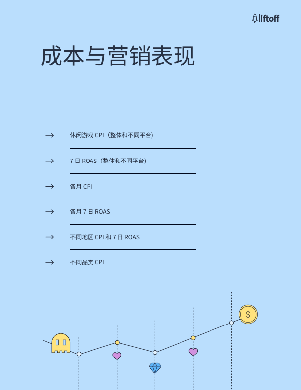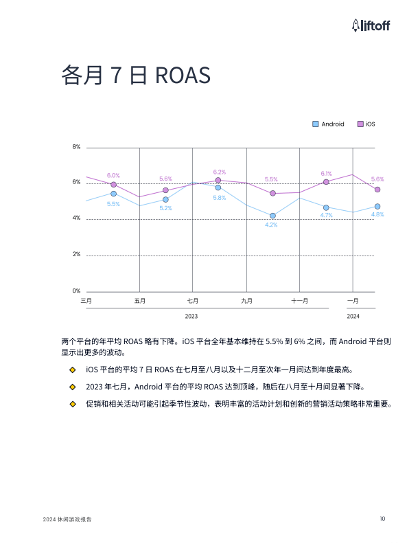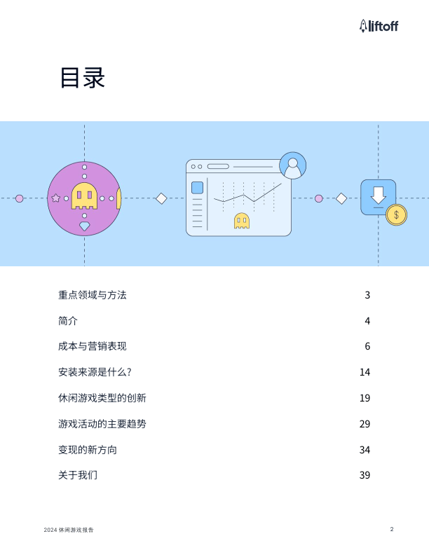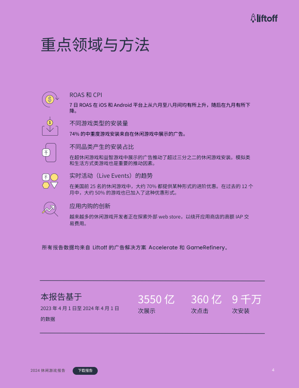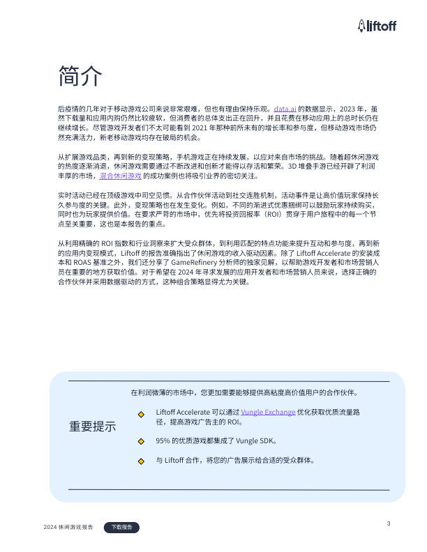 从利⽤精确的 ROI 指数和⾏业洞察来扩⼤受众群体,到利⽤匹配的特点功能来提升互动和参与度,再到新 的应⽤内变现模式,Liftoff 的报告准确指出了休闲游戏的收⼊驱动因素。除了 Liftoff Accelerate 的安装成 㬀和 ROAS 基准之外,我们还分享了 GameRefinery 分析师的独家⻅解,以帮助游戏开发者和市场营销⼈ 员在重要的地⽅获取价值。对于希望在 2024 年寻求发展的应⽤开发者和市场营销⼈员来说,选择正确的 合作伙伴并采⽤数据驱动的⽅式,这种组合策略显得尤为关键。