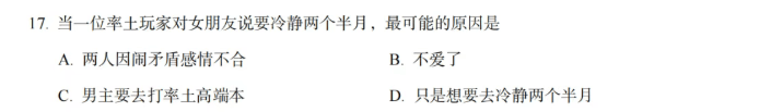 现在玩家都管这个家族叫 “率土教委”,招新严格,但出的题一点不枯燥:既有 “刘备三顾茅庐时,诸葛亮几岁” 这种能勾起三国情怀的正经题;也有 “游戏里‘战必断金’战法的‘必’字,到底是不是通假字” 这种结合游戏细节的 “抠题”;最让人会心一笑的是道选择题:“你跟女朋友说‘冷静两周别找我’,最可能的原因是?这种懂梗的题一出来,玩家们都在评论区调侃 “太真实了,这题我闭眼选 C”。